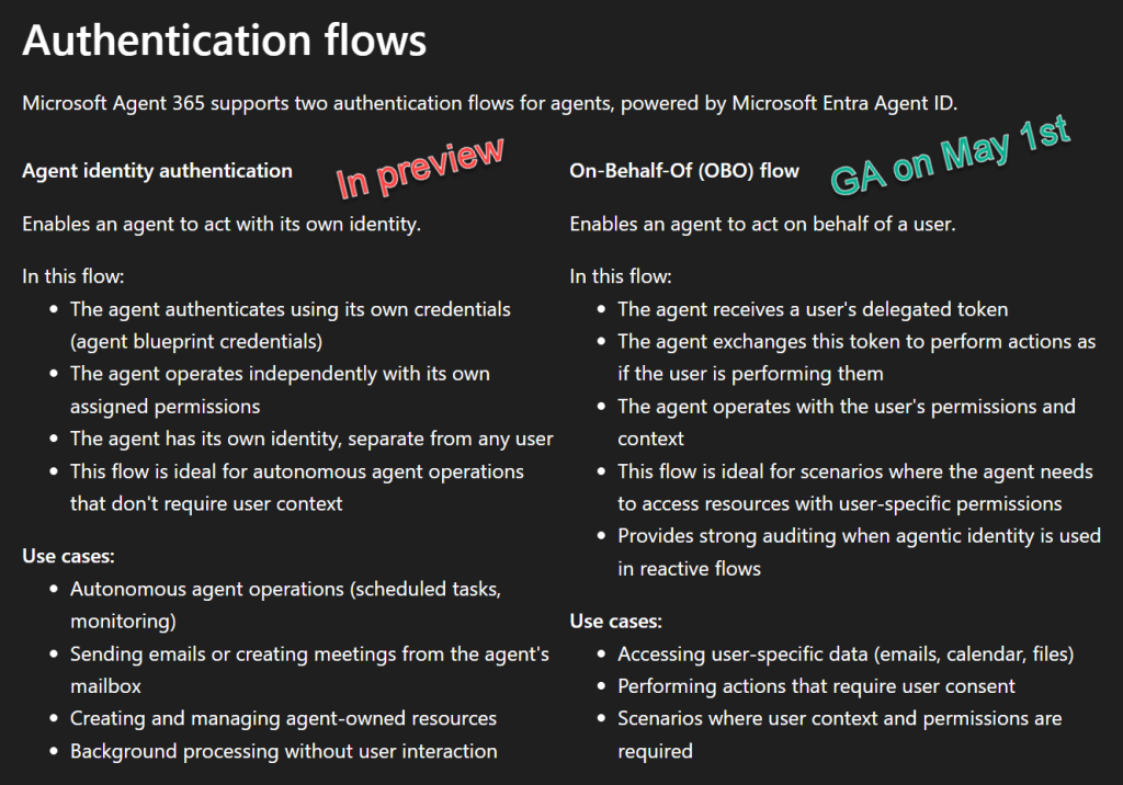 So, just because the agents have been automatically listed in the Entra ID directory ever since the preview of Entra Agent ID was launched almost a year ago, true agentic worker identity will not arrive in the Microsoft cloud just yet. Out of the two authentication flows that Entra Agent ID supports, only the On-Behalf-Of (OBO) flow will be an Agent 365 GA feature. Agent identity authentication will remain in preview by the looks of things.