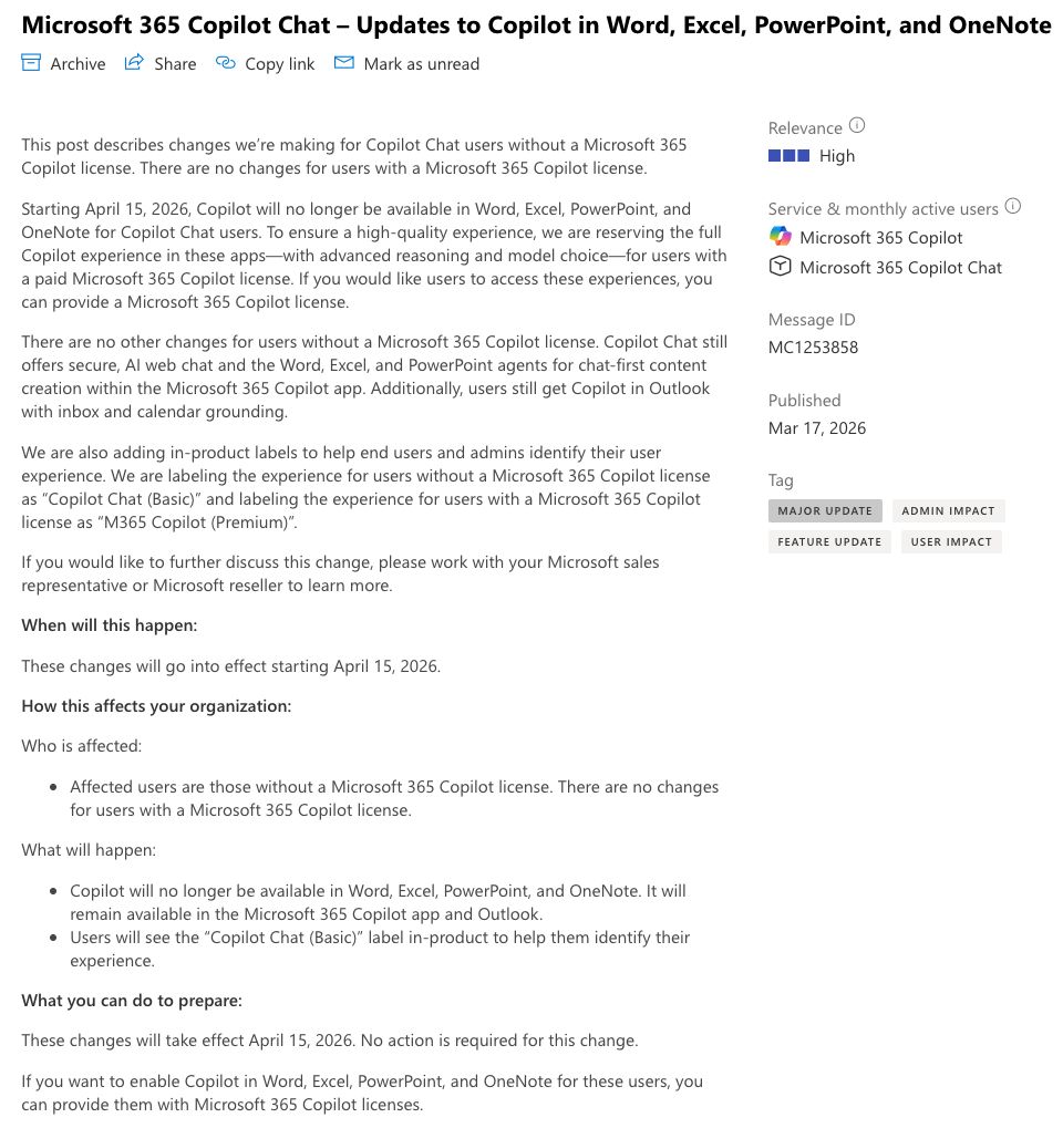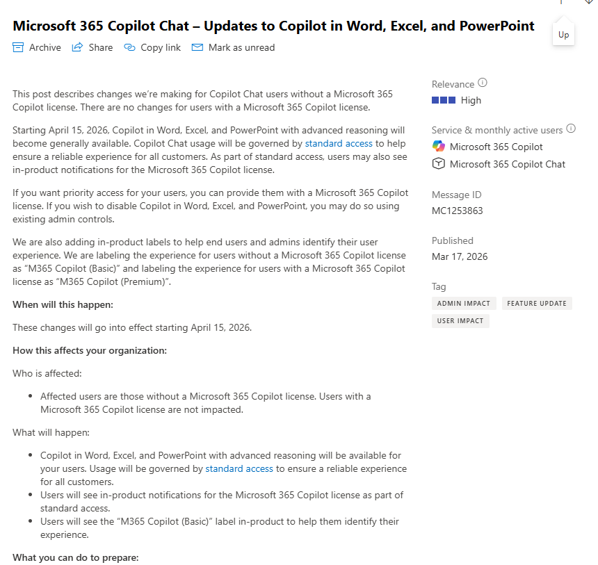 On March 17, 2026, we saw the M365 Message Center message MC1253863 announce: “Starting April 15, 2026, Copilot in Word, Excel, and PowerPoint with advanced reasoning will become generally available. Copilot Chat usage will be governed by standard access to help ensure a reliable experience for all customers”.