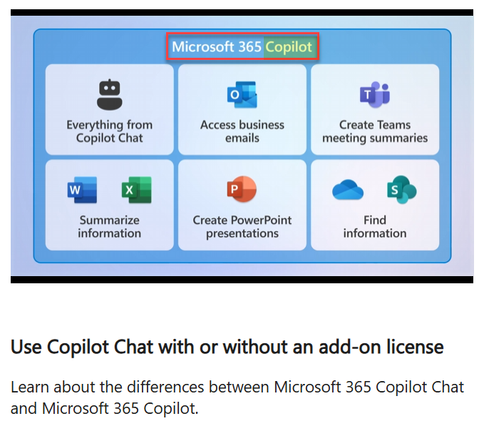 Support pages such as “How Copilot Chat works with and without a Microsoft 365 Copilot license” often do not keep up with the latest entitlements. Oversimplified explainer videos like the one on that page are even worse, due to how difficult it is to update them as the products and licensing terms evolve. For instance, the below screen that should illustrate what the premium add-on offers isn’t very useful at this point anymore.