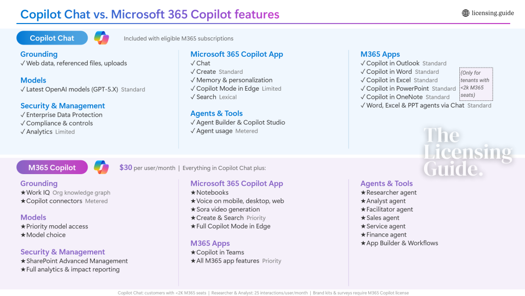 Rather than showing the traditional Microsoft product comparison table where feature names are on the far left and then a column for each SKU in question either has a bullet, doesn’t have it, or has something in between – I personally prefer this stacked approach. It does a better job of visualizing how even the base tier of Copilot Chat offers a wealth of capabilities.